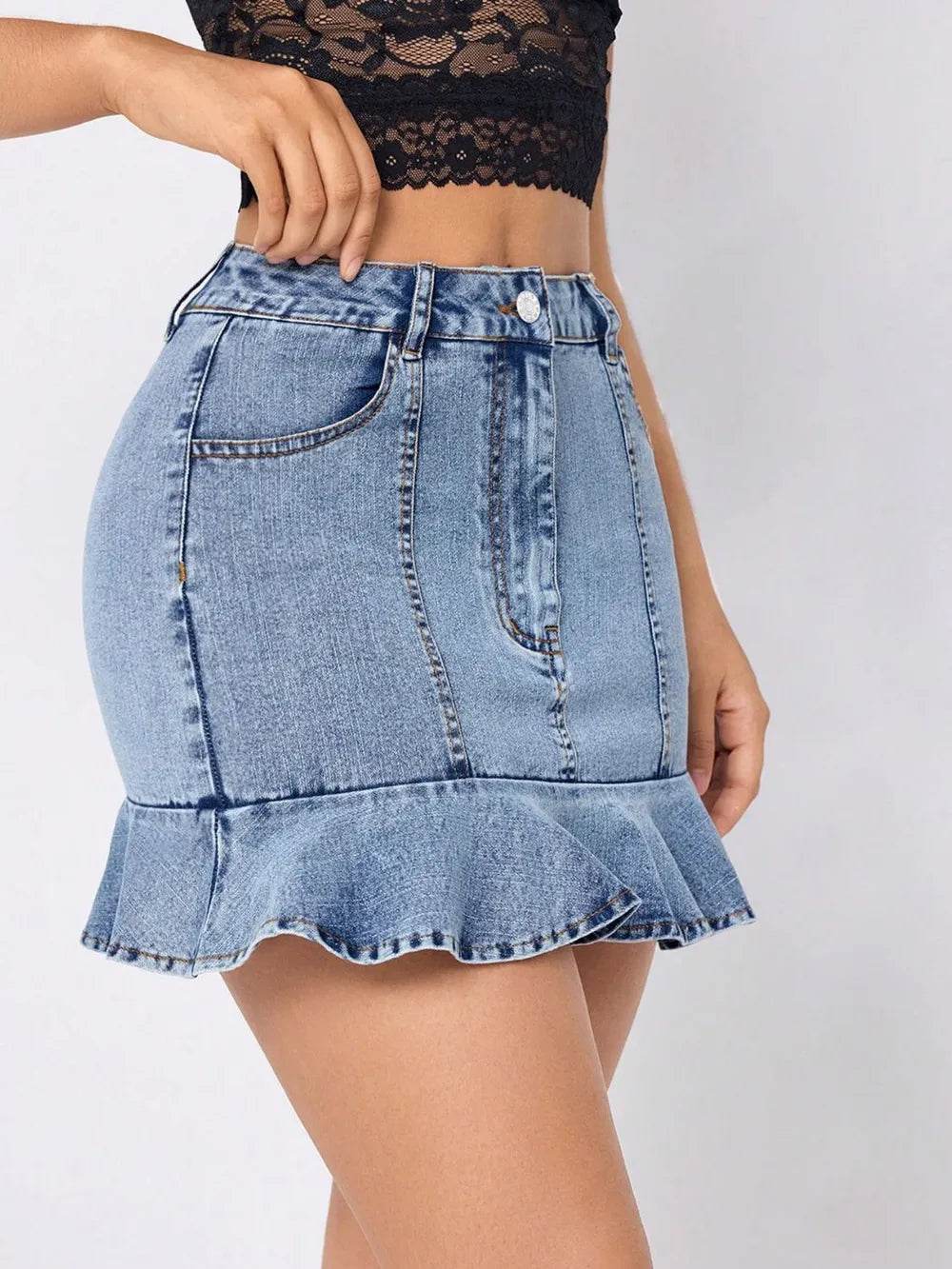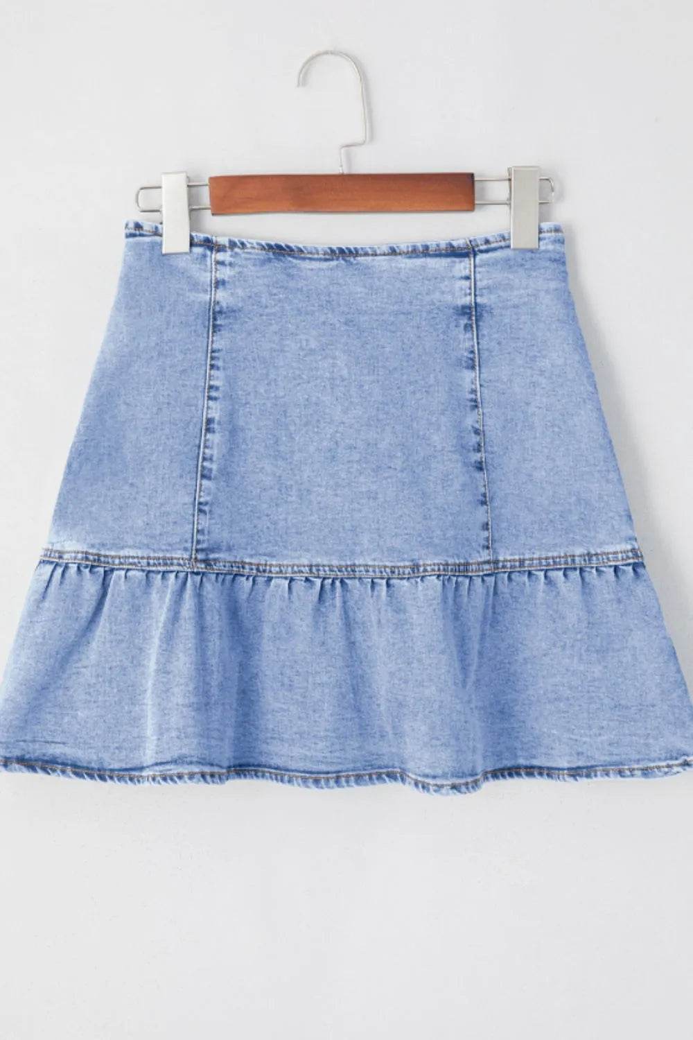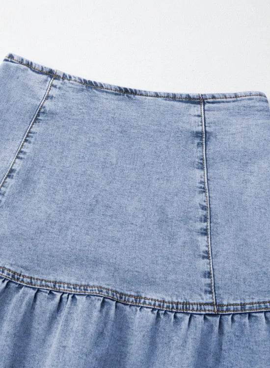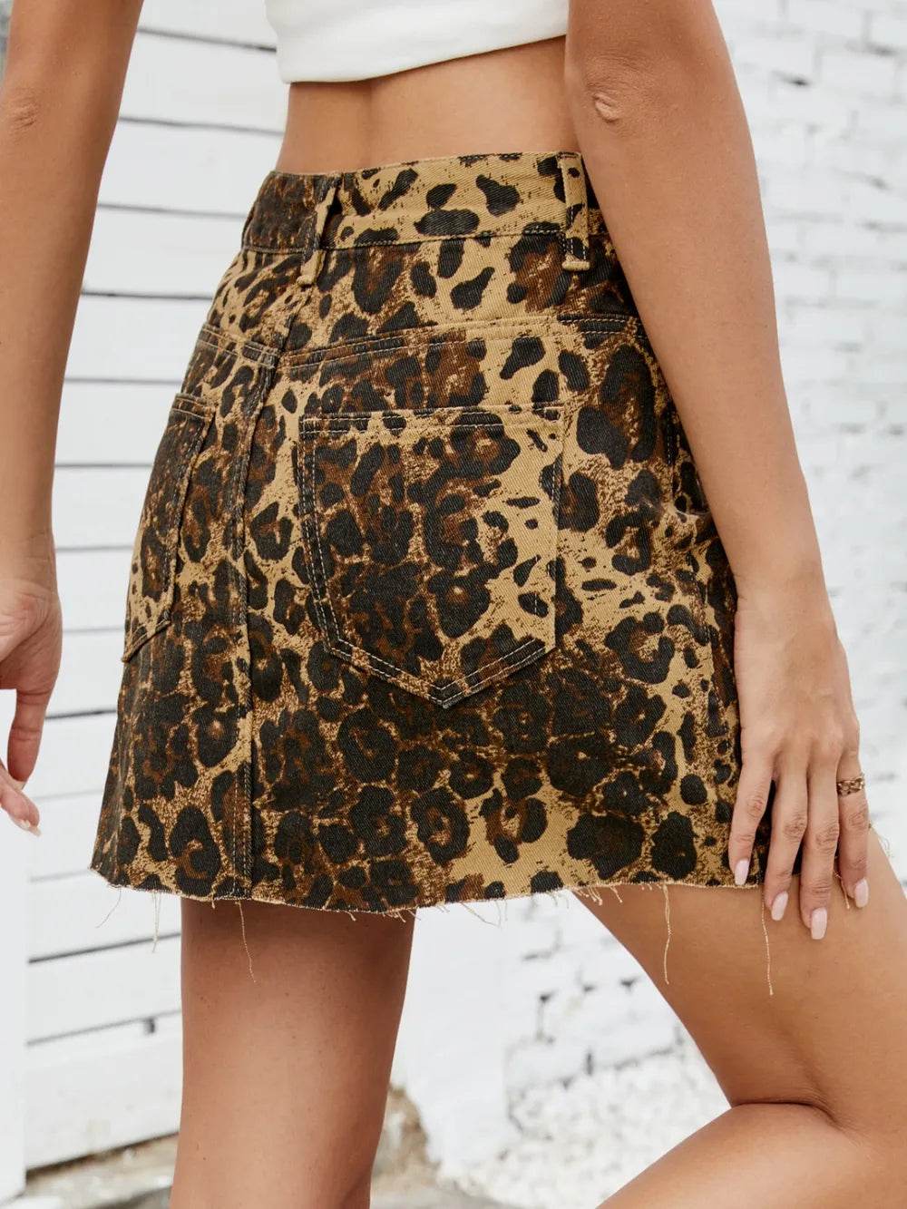 A leopard denim mini skirt offers a fun and bold twist on a classic denim piece, blending the edginess of denim with the fierce print of leopard. This skirt is a statement piece that adds a touch of personality and style to any outfit. Pair it with a simple top and sneakers for a casual look, or dress it up with a blouse and heels for a more elevated ensemble. The leopard denim mini skirt is a versatile and trendy option that can be easily incorporated into your wardrobe for a fashion-forward look.