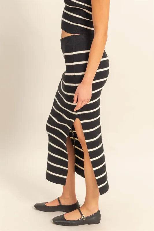 The Side Slit Striped Bodycon Sweater Skirt is a stylish and form-fitting skirt made from sweater material. Featuring a bodycon silhouette that hugs the curves, this skirt accentuates the figure for a flattering look. The side slits and striped design add a touch of flair and visual interest to the classic bodycon style. Perfect for showcasing your shape while staying cozy and chic during the colder months. Pair it with a fitted top or sweater for a trendy and put-together outfit.