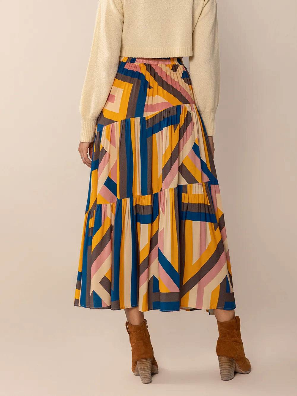 The Printed Midi Skirt is a versatile and fashionable wardrobe staple. The eye-catching print adds a pop of style to any outfit, while the midi length offers a flattering silhouette. Perfect for work or casual settings, this skirt can be styled with a blouse or a t-shirt for a chic and effortless look.