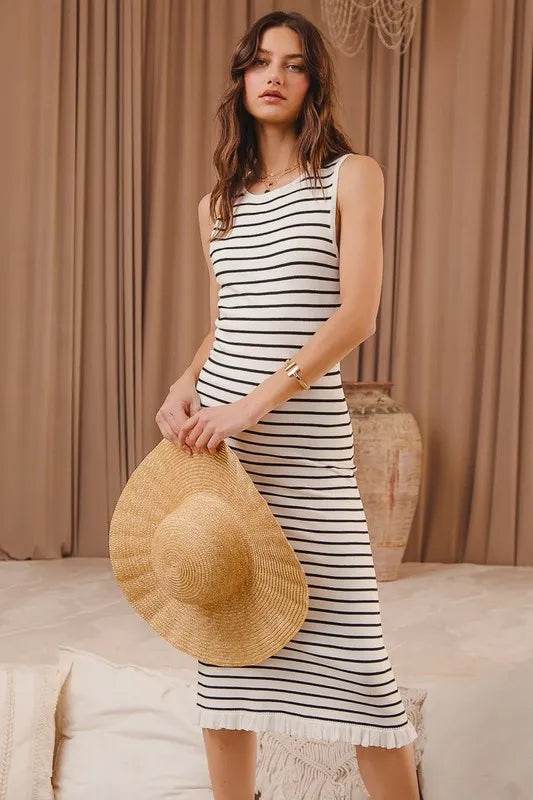 The Stripe Sleeveless Sweater Knit Maxi Dress With Ruffled Hem is a chic and elegant choice for any occasion. Featuring a striped pattern and a sleeveless design, this maxi dress offers a stylish and sophisticated look. The ruffled hem adds a touch of flair and movement to the outfit, making it a versatile option for both casual and dressier events. Pair it with sandals or heels for a fashionable and polished ensemble.