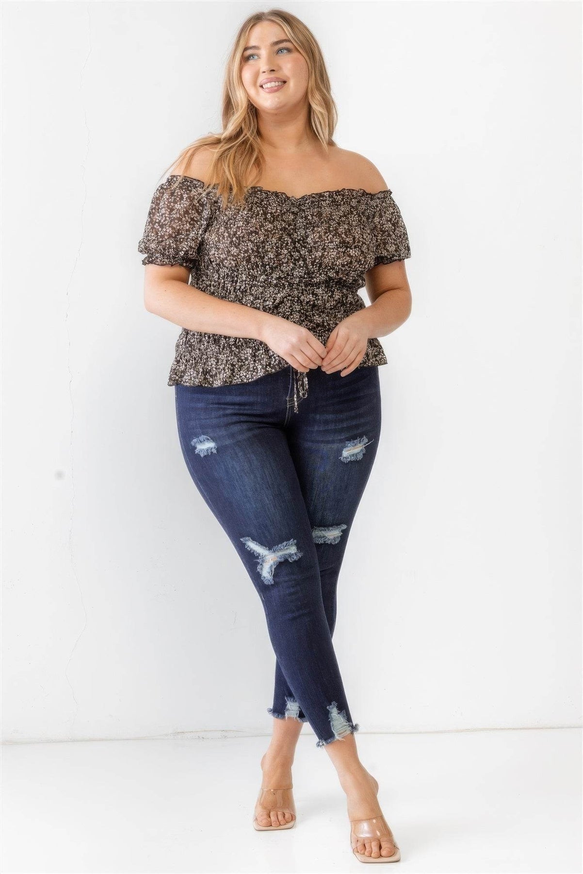 Why Choose Plus Floral Chiffon Ruched Smocked Off-the-Shoulder Top?