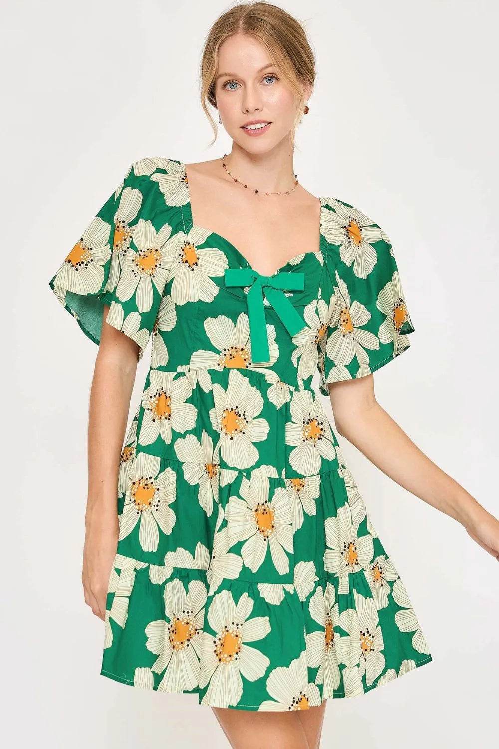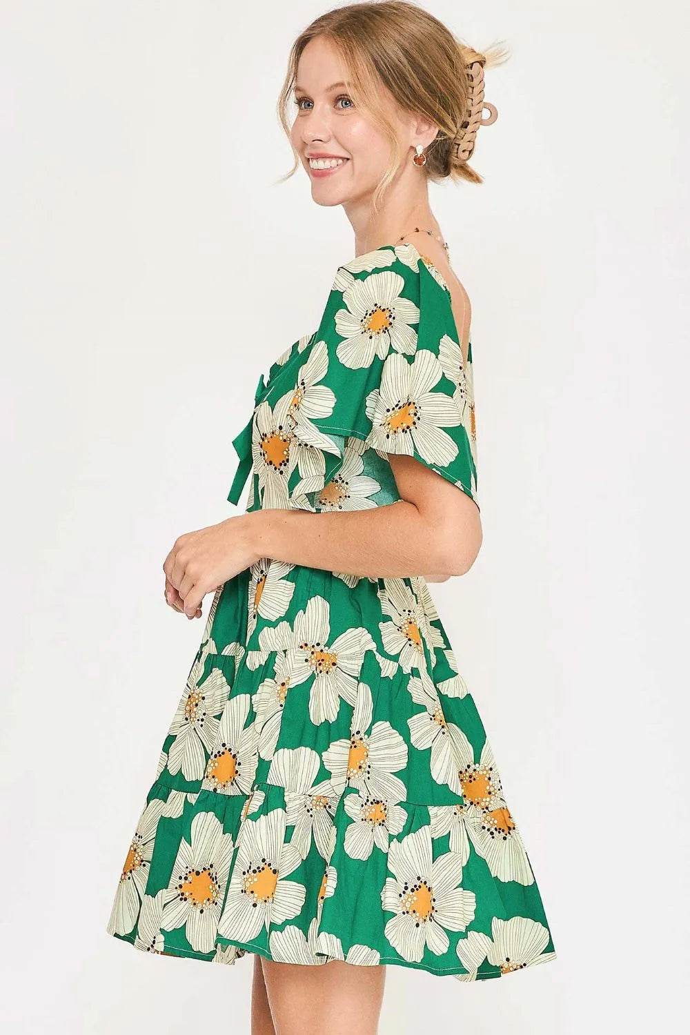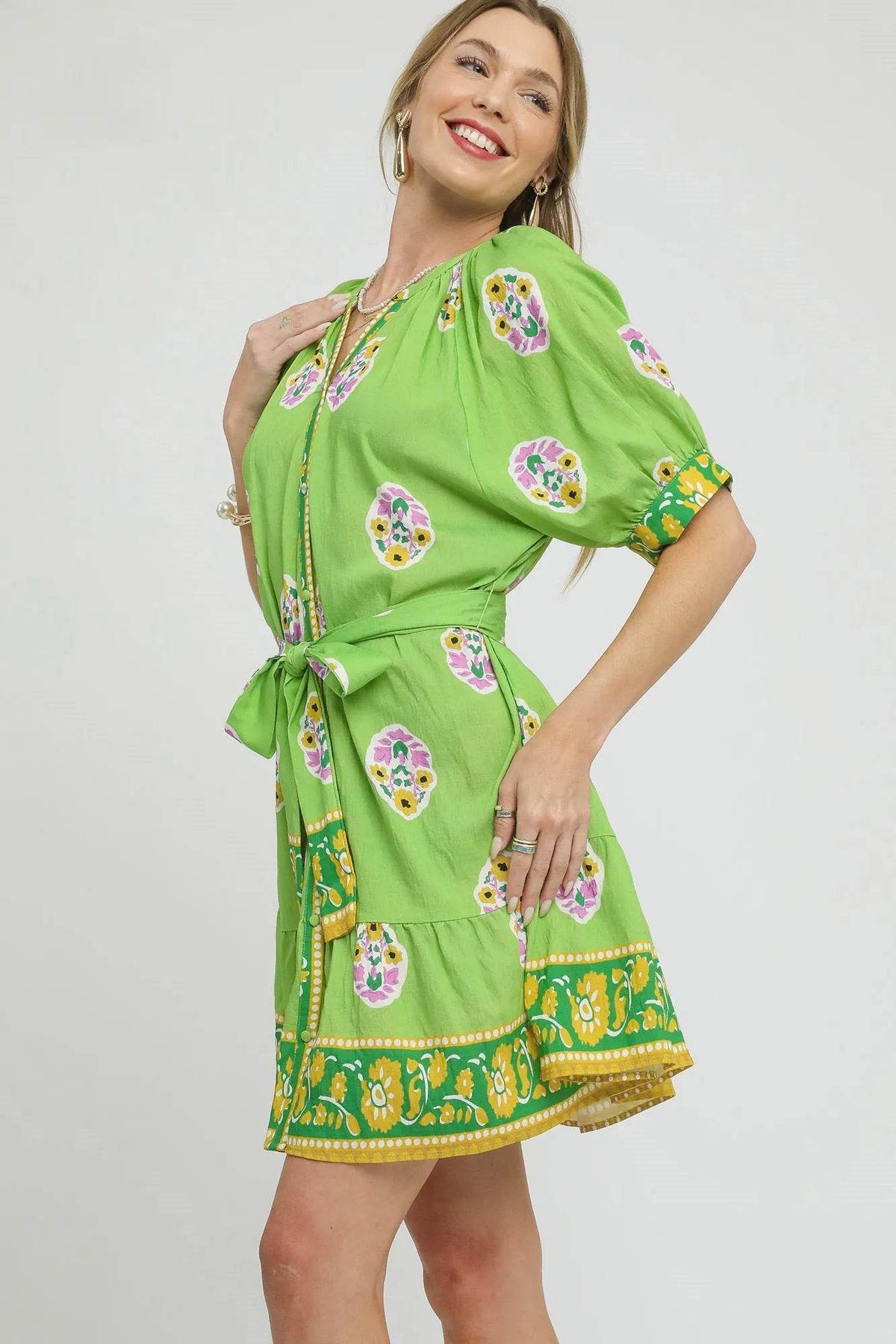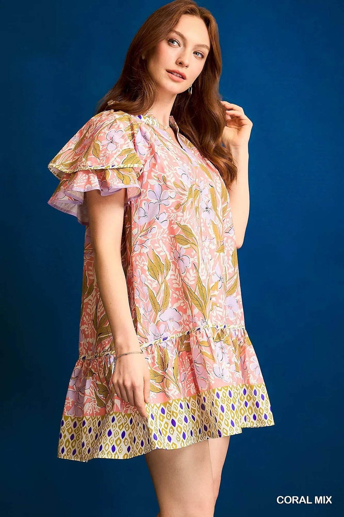 Umgee Full Size Daisy Print Mini Dress with Ribbon Details Plus Size