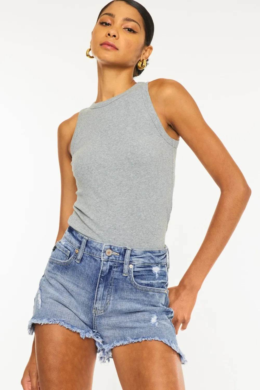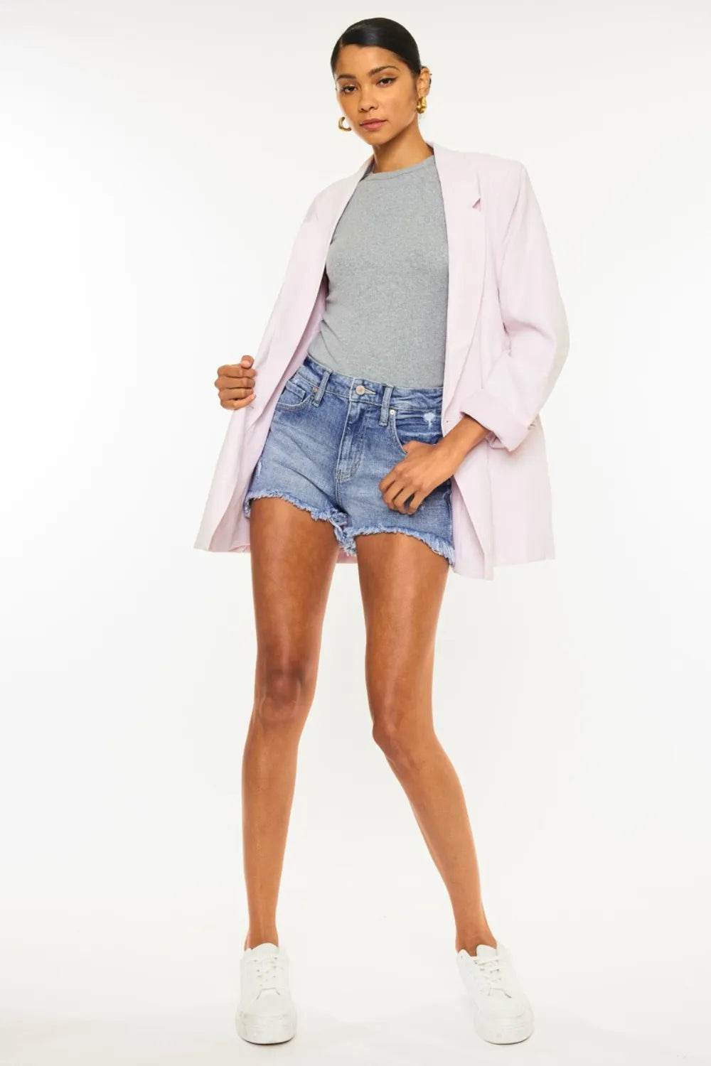 Distressed Raw Hem Denim Shorts are a must-have for those who love a cool and edgy style. The distressed detailing adds a touch of ruggedness and creates a lived-in look, while the raw hem gives them a modern and casual vibe. These shorts are perfect for showcasing your individuality and creating effortlessly stylish outfits. Pair them with a simple tee and sneakers for a casual and relaxed look, or dress them up with a flowy blouse and sandals for a chic summer ensemble. Stay on-trend and express your unique fashion sense with these fashionable distressed raw hem denim shorts.