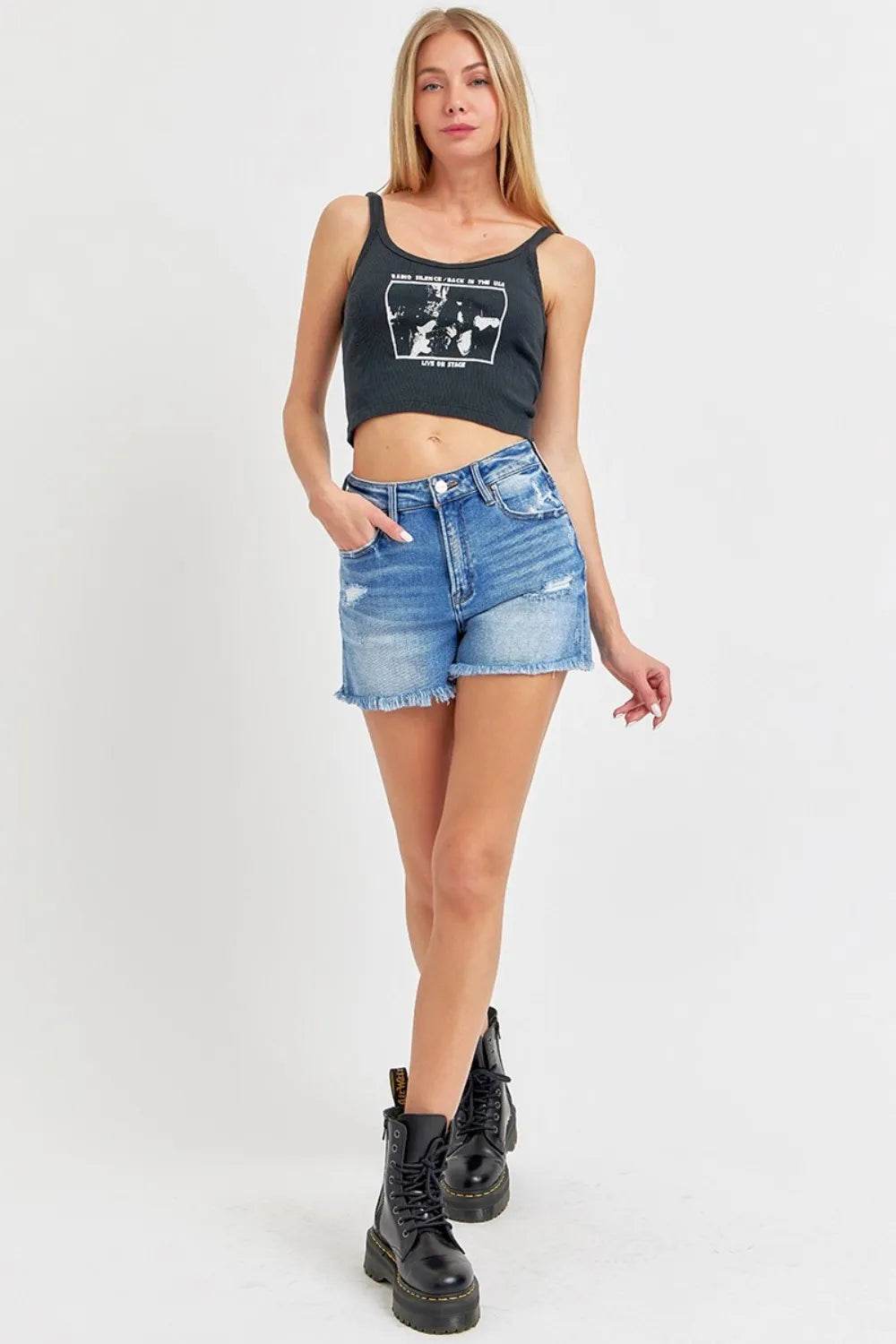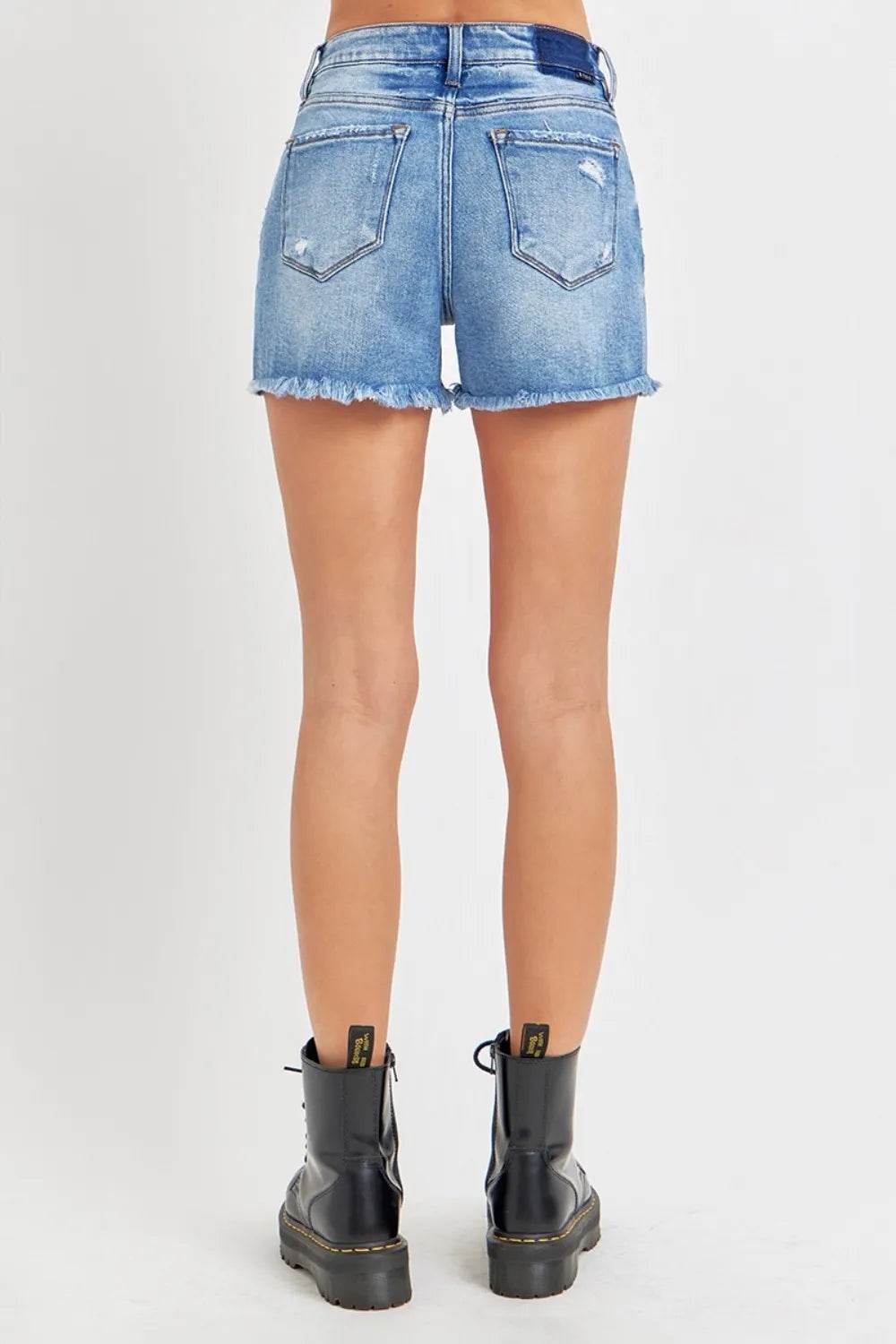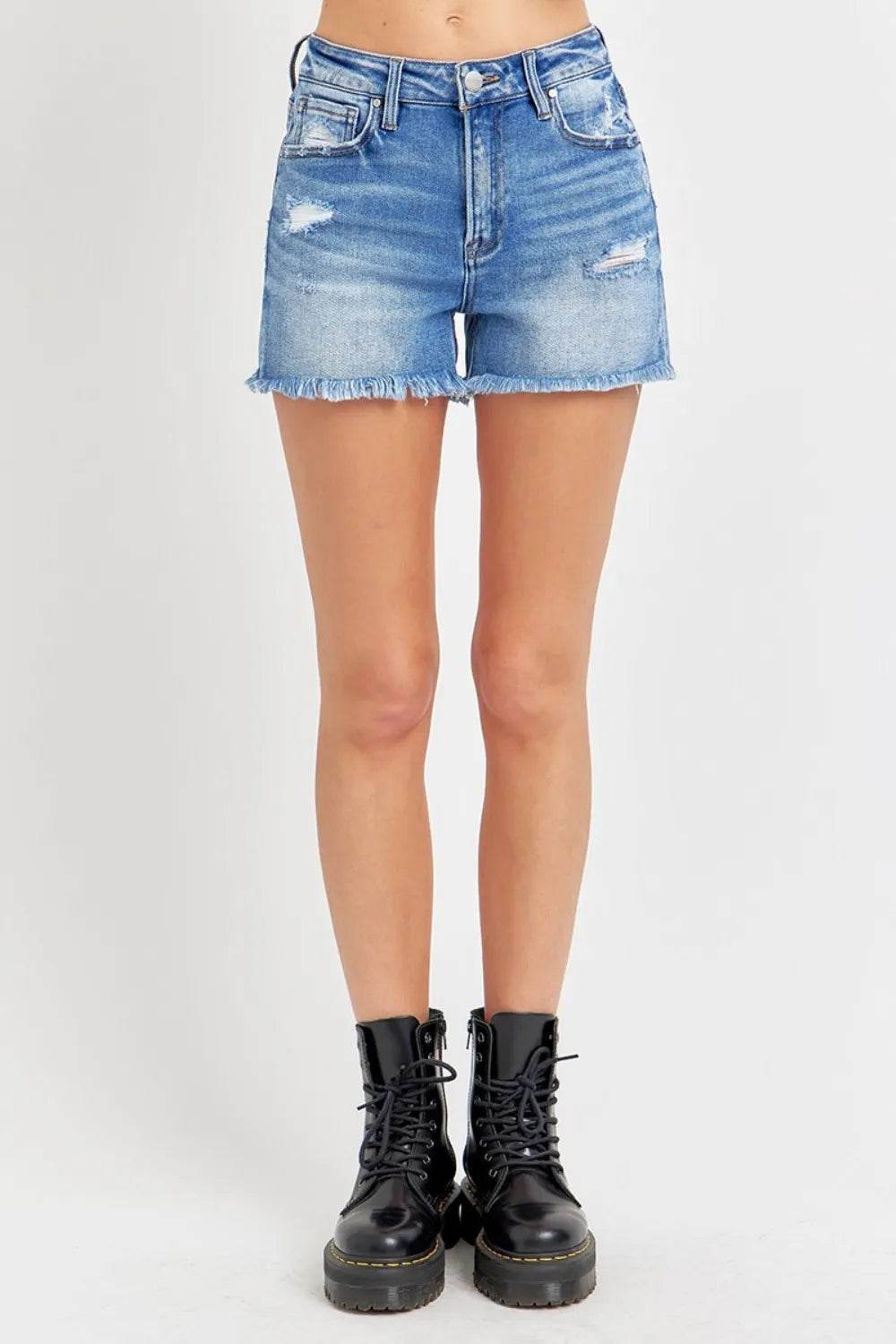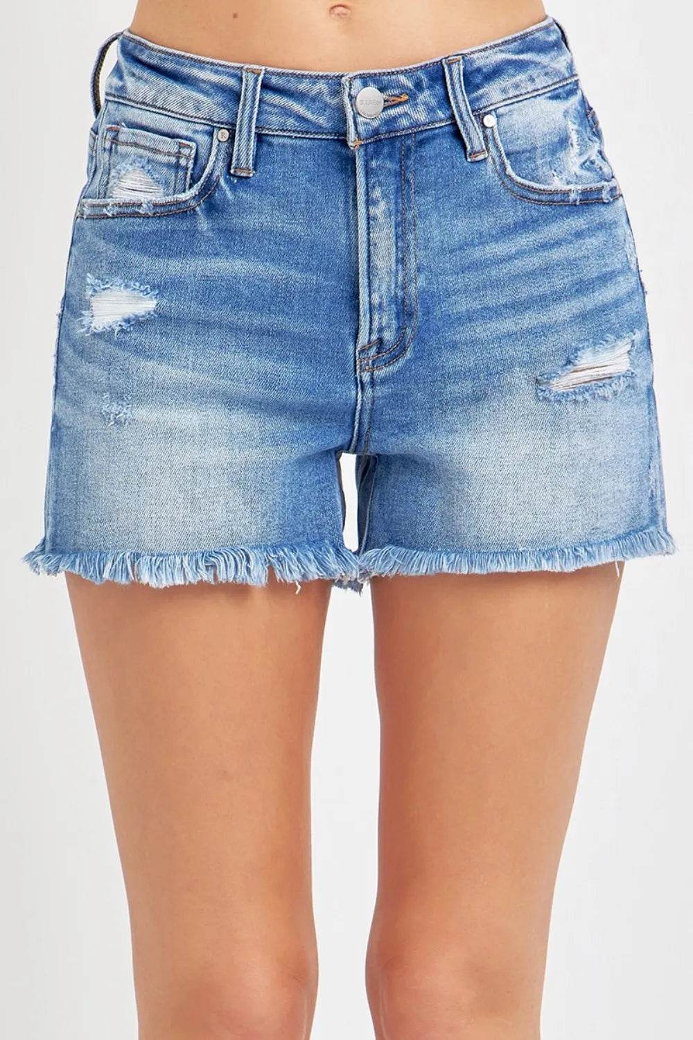 The High Rise Distressed Raw Hem Denim Shorts offer a trendy, contemporary look with a high-waist design and raw hem detailing. The high rise accentuates your waist and creates a flattering silhouette, while the distressed elements add a touch of rugged charm. The raw hem provides a modern, unfinished look, enhancing the shorts' casual, laid-back vibe. Crafted from durable denim, these shorts are both stylish and comfortable, making them a versatile choice for summer adventures or relaxed outings.