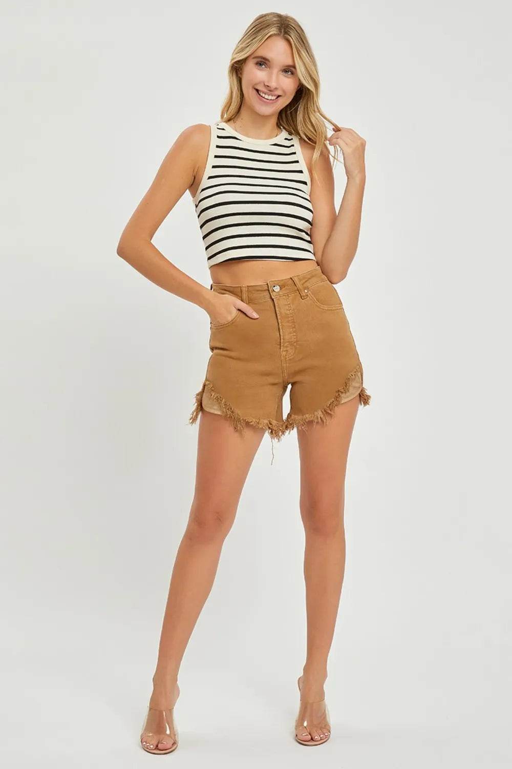 RISEN High Waist Frayed Hem Denim Shorts - Ebony's Shopping