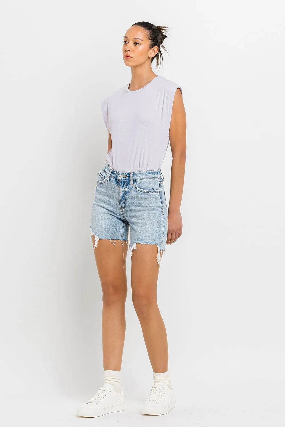 High Rise Denim Shorts are a classic and versatile summer staple that features a high-rise waist for a flattering fit. These shorts typically hit above the natural waistline, elongating the legs and accentuating the waist. They offer a timeless and chic look that can be dressed up or down for various occasions. High Rise Denim Shorts are perfect for creating casual and effortless outfits during the warmer months. Pair them with a tucked-in tee or blouse, sandals or sneakers, and your favorite accessories for a stylish and comfortable ensemble. Whether you're running errands or enjoying a day out, high rise denim shorts are a go-to choice for a laid-back yet trendy look.
