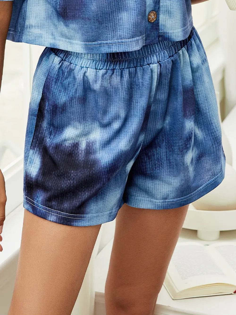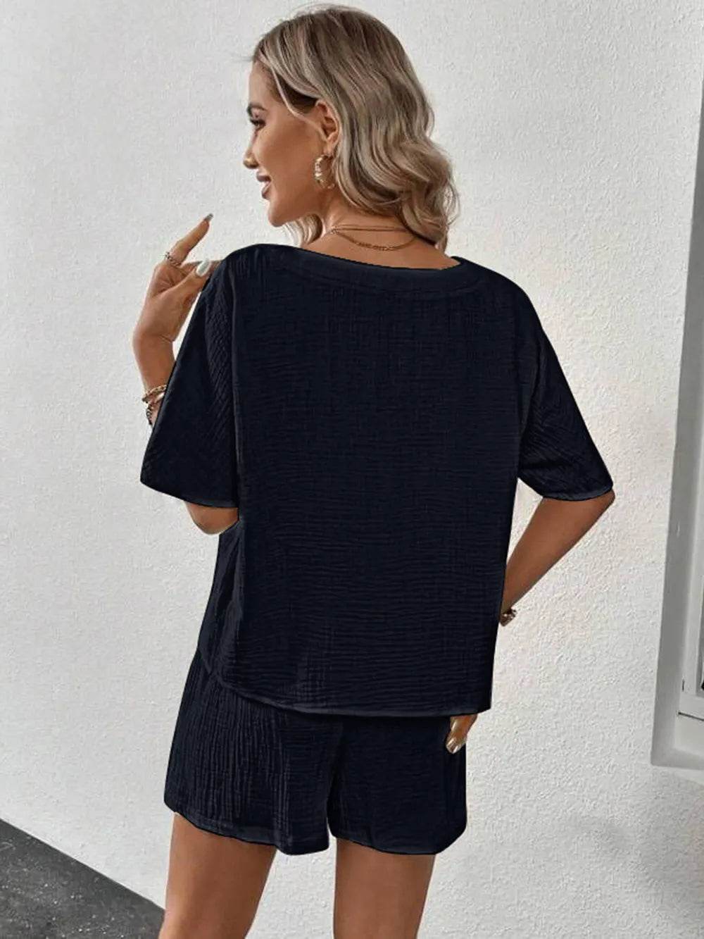 Stay cool and comfortable in this V-neck short sleeve slit t-shirt and shorts set. The lightweight fabric and trendy design make it perfect for casual outings or lounging at home. Mix and match with other pieces in your wardrobe for endless styling options.