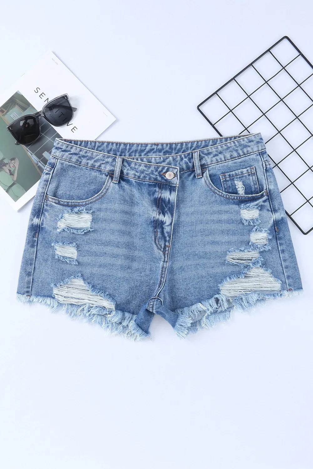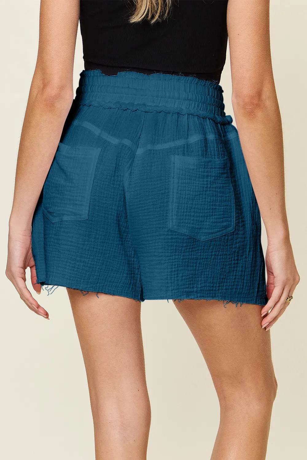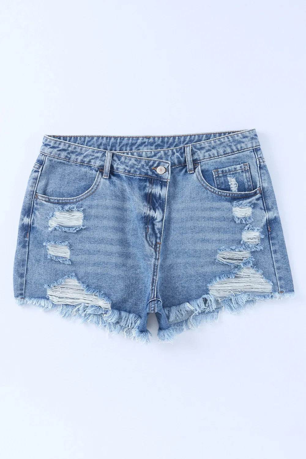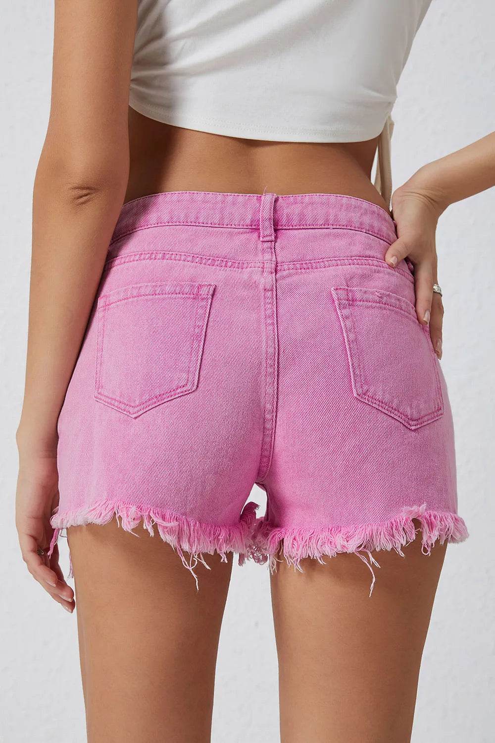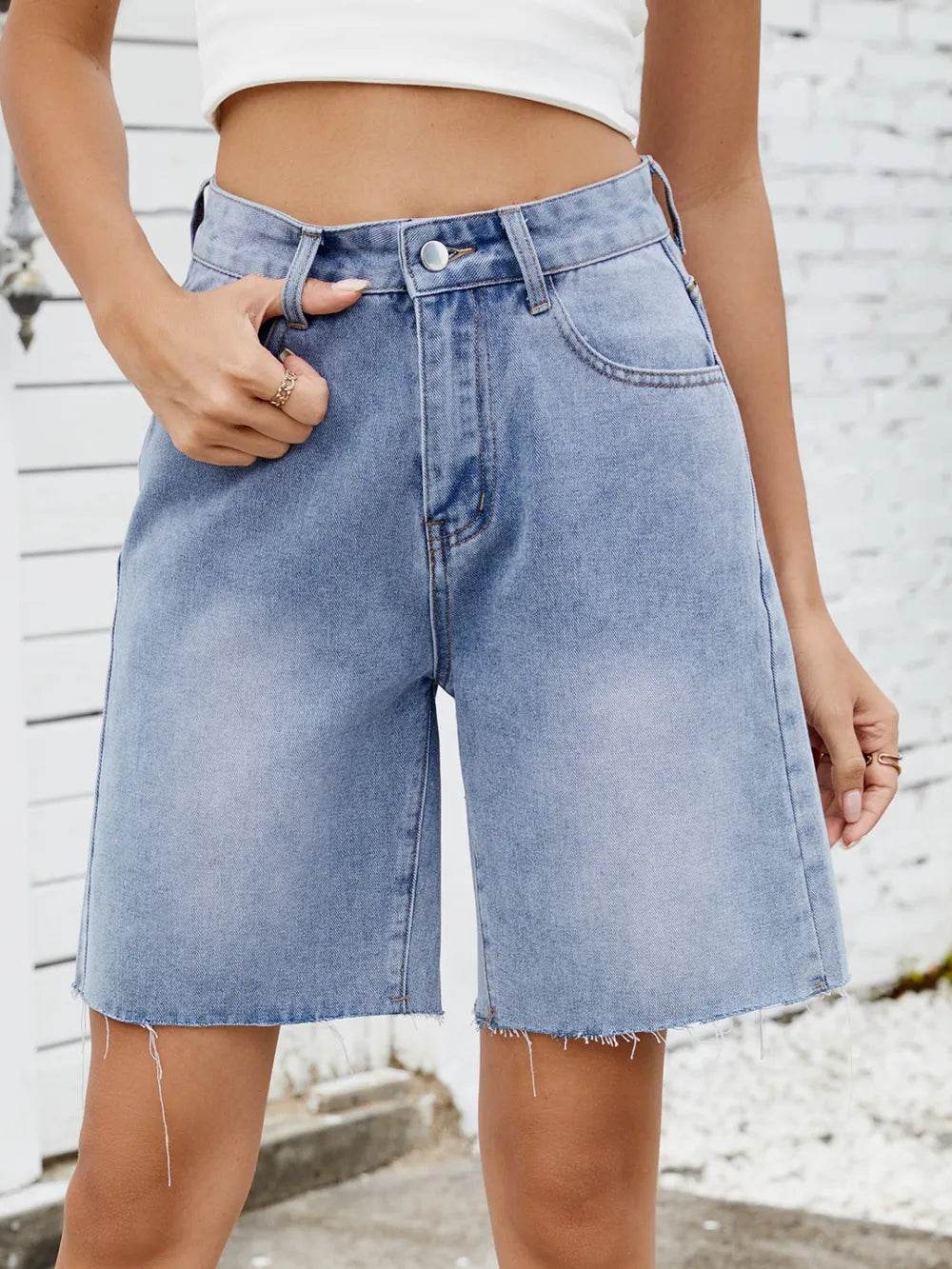 These tummy control high waist raw hem denim shorts are the perfect combination of style and comfort. The high waist design helps to smooth and shape your midsection, providing a flattering fit. The raw hem adds a trendy and edgy touch to the classic denim shorts. Made from a stretchy denim material, these shorts offer a comfortable and flattering fit. The tummy control feature is great for enhancing your silhouette and providing extra support. Pair these shorts with a tucked-in tank top or a flowy blouse for a chic and casual look. The raw hem detail adds a modern flair to your outfit, making these shorts a versatile and on-trend piece for your summer wardrobe.