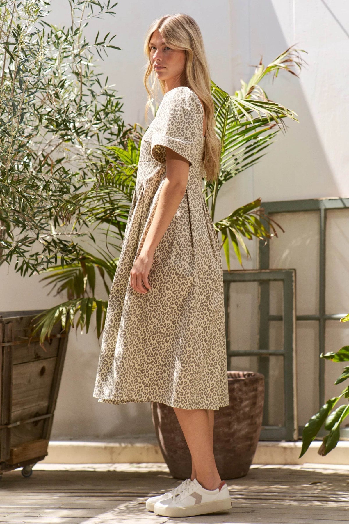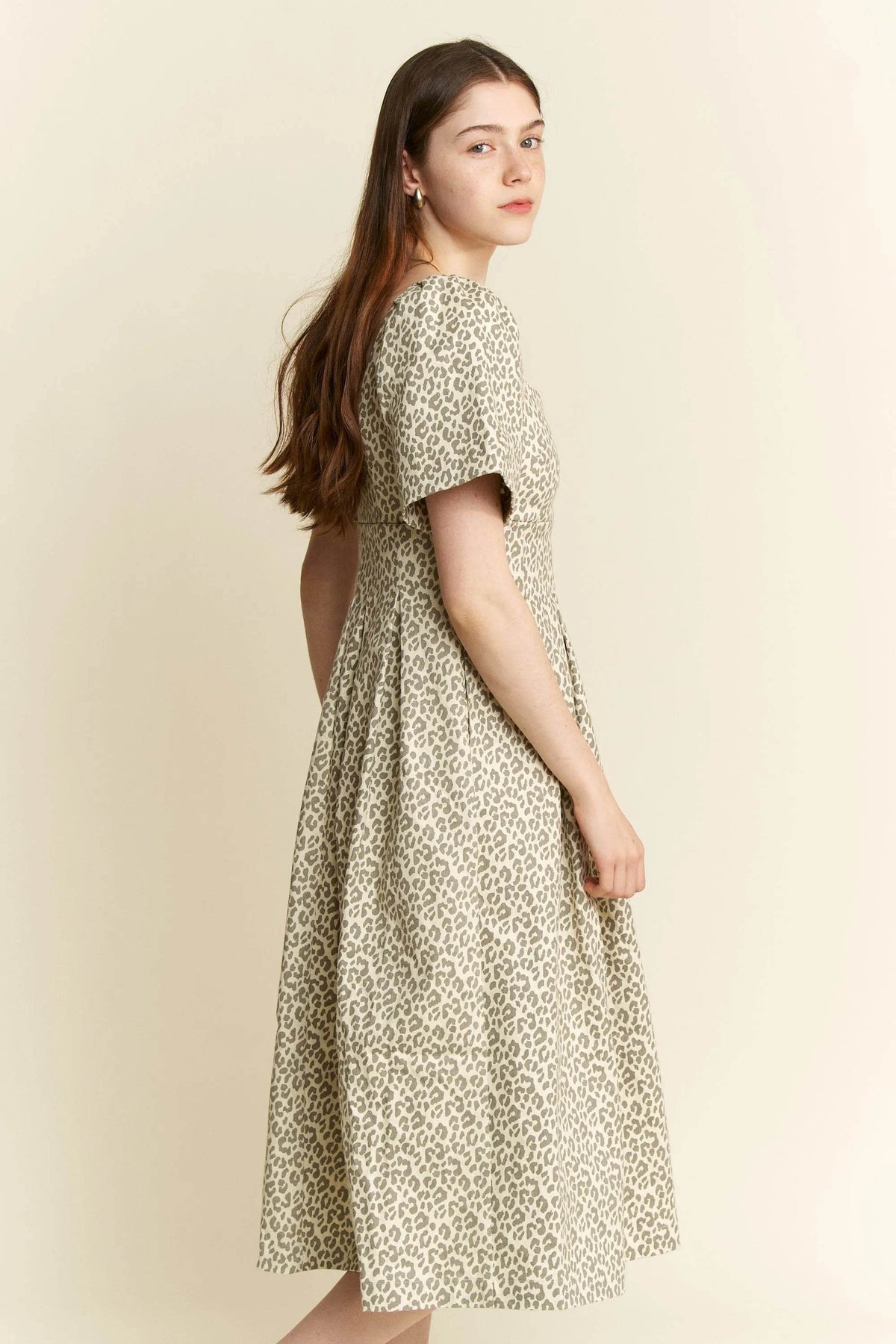 This stunning midi dress features an eye-catching leopard print pattern in neutral tones, crafted with a feminine square neckline and decorative button-front detail. The bell sleeves add a bohemian touch while the fit-and-flare silhouette creates a universally flattering shape. Made from lightweight, breathable fabric perfect for warm weather, this versatile piece transitions effortlessly from casual daytime wear to evening occasions. The midi length offers modest coverage while maintaining a stylish aesthetic.