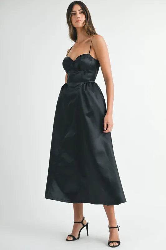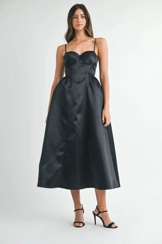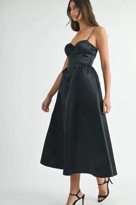 The Solid Taffeta Spaghetti Strap Bustier Midi Dress is an elegant and sophisticated dress featuring a structured bustier bodice and a midi length. This dress is crafted from luxurious taffeta fabric, offering a sleek and polished look. The spaghetti straps add a delicate touch, while the bustier detail provides a flattering and form-fitting silhouette. Perfect for special occasions or formal events, this midi dress is a timeless and chic choice for a standout ensemble.