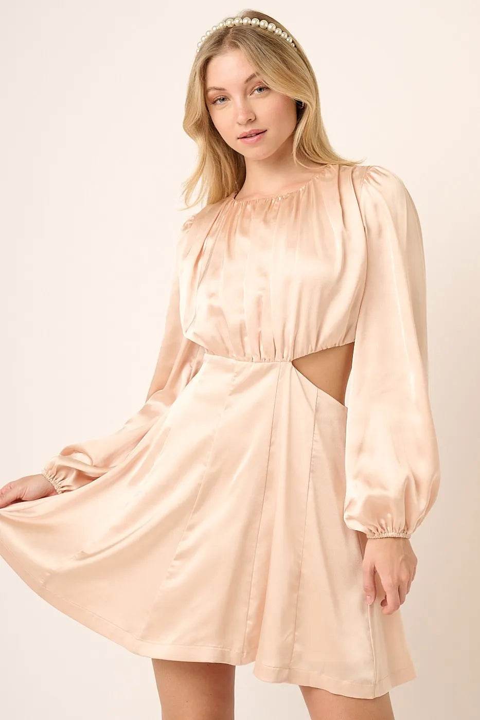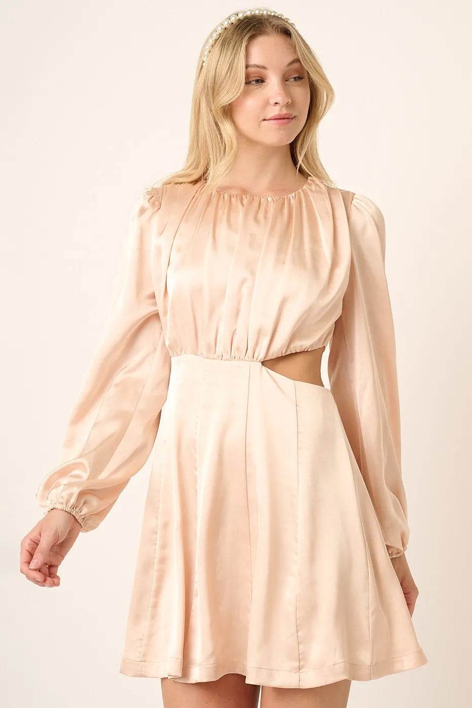 This mini dress features side cutout details and is made from luxurious satin fabric for a chic and sophisticated look. The side cutouts add a touch of edginess and allure to the dress. Perfect for a night out or a special event, this dress is sure to turn heads. Elevate your style with this trendy and glamorous satin side cutout detail mini dress!