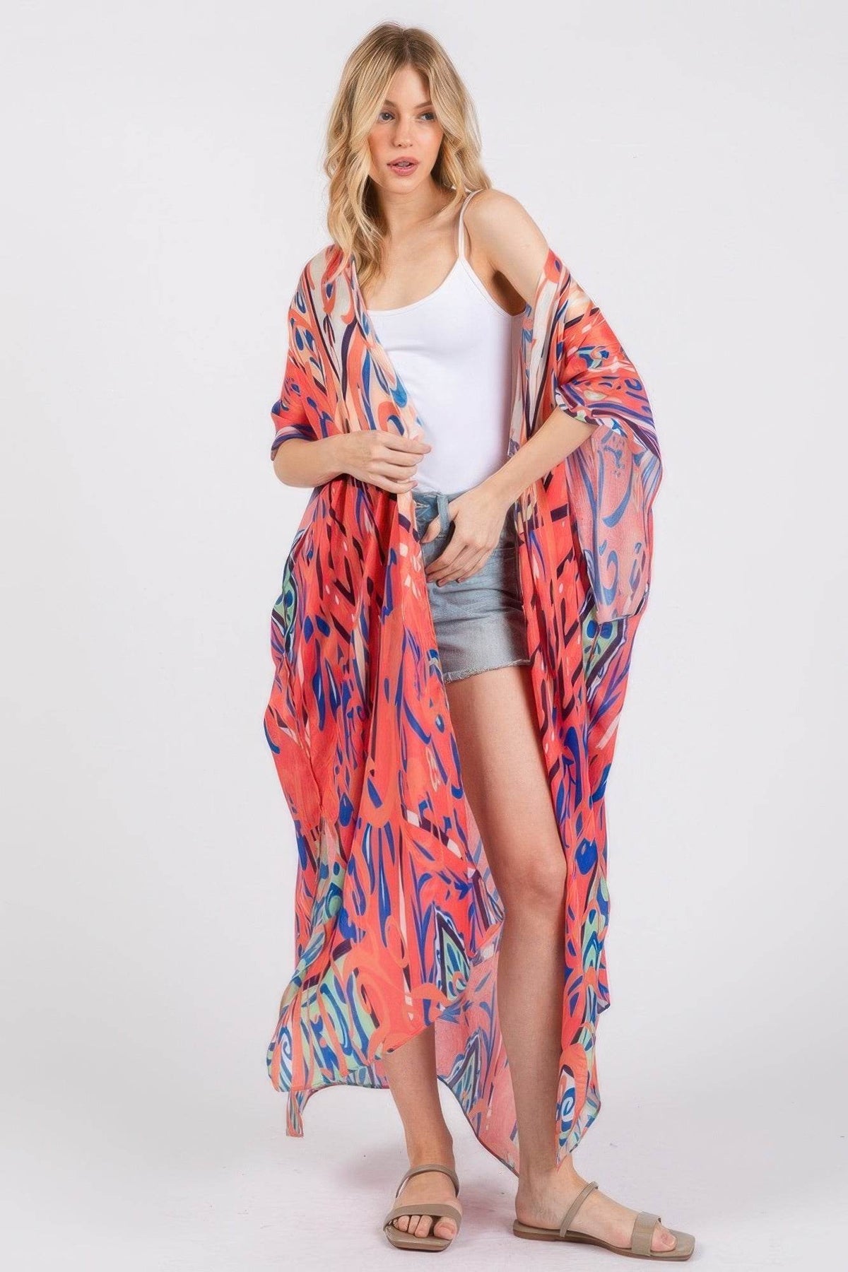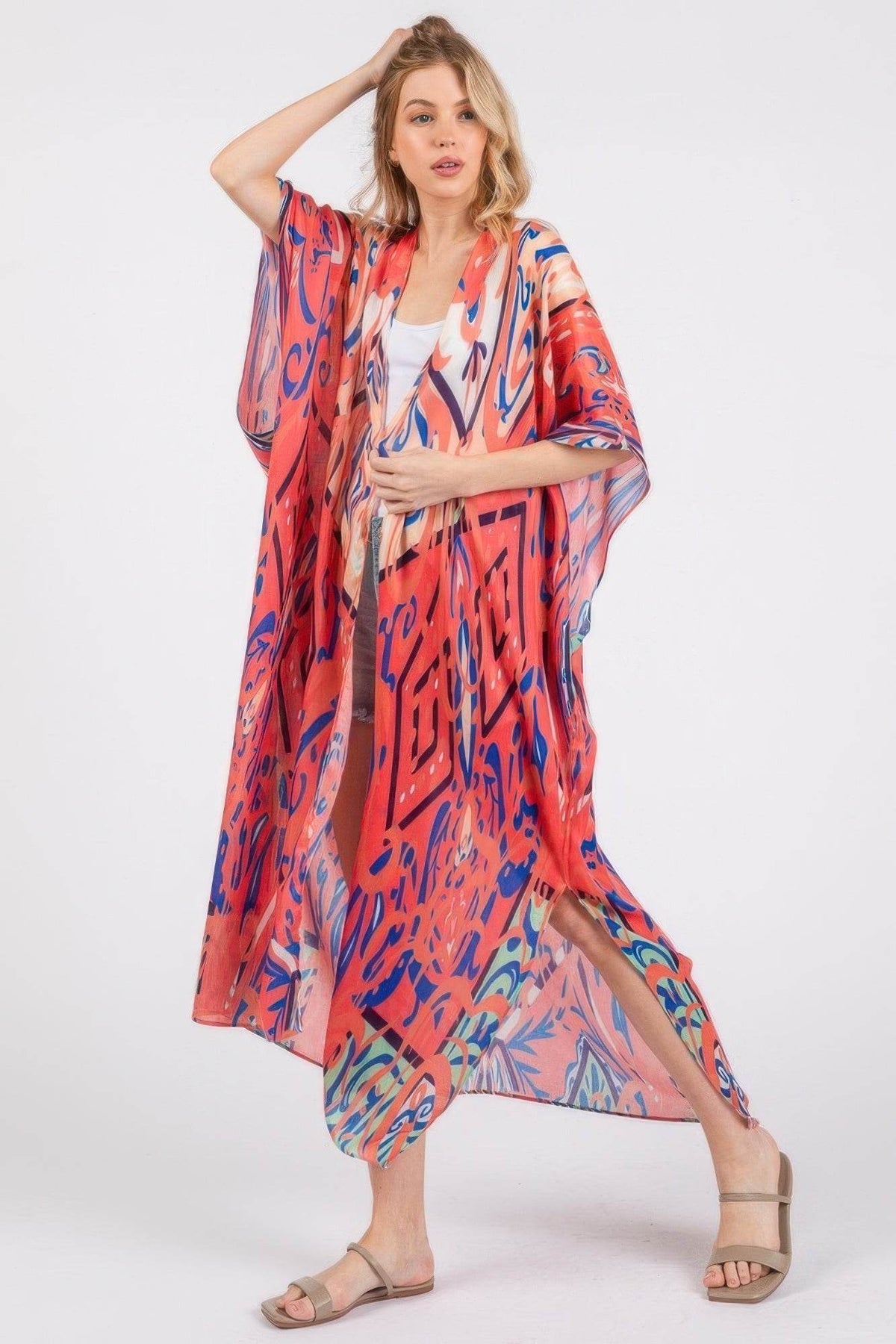 Add a vibrant flair to your everyday look with the Boho Print Open Front Long Kimono. This eye-catching piece features an open-front silhouette with a lightweight, airy feel, making it the ideal layering essential for warm-weather days. The bold bohemian print brings an artistic edge to your outfit, whether you're styling it over swimwear, denim, or dresses. Its flowing drape and colorful palette offer effortless elegance and versatility from day to night.