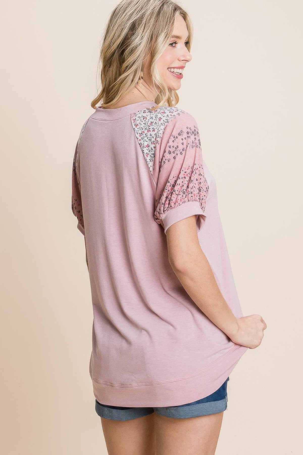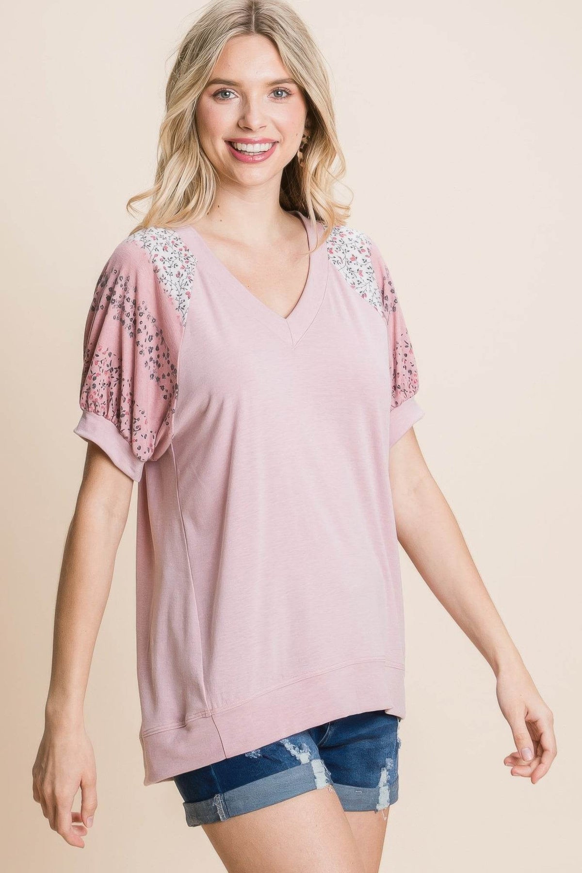 Refresh your wardrobe with this Floral Printed Puff Sleeves V-Neck Top. Combining a solid v-neck body with delicate floral ombre puff sleeves, this top delivers a polished yet playful look. The mini puff sleeves add volume and charm without overwhelming the silhouette, making it an easy choice for day-to-evening style. Crafted from a soft, breathable blend of polyester, rayon, and spandex, it offers both comfort and a flattering drape. Pair it with denim or skirts for a refined, everyday ensemble.
