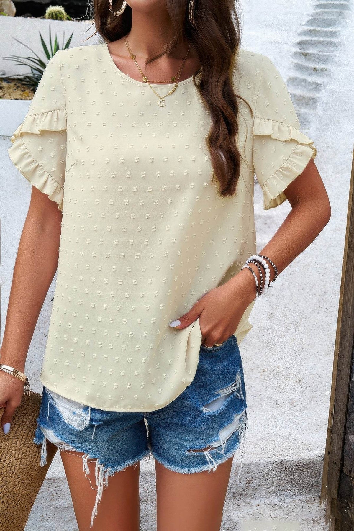 Lightweight and charming, this chiffon polka dot top brings a playful yet polished touch to your everyday wardrobe. Made from 100% polyester, it features a soft, flowy feel with subtle texture. The classic crewneck design is complemented by short sleeves and delicate ruffle accents, creating a flattering silhouette with a touch of femininity. Finished with an allover polka dot print, this top is perfect for everything from casual outings to vacation days. Pair it with jeans, skirts, or shorts for an easy, stylish look.