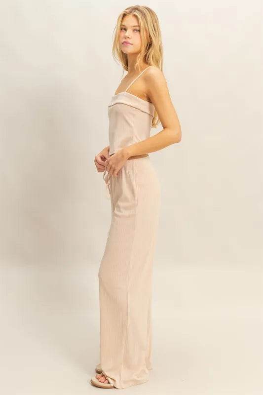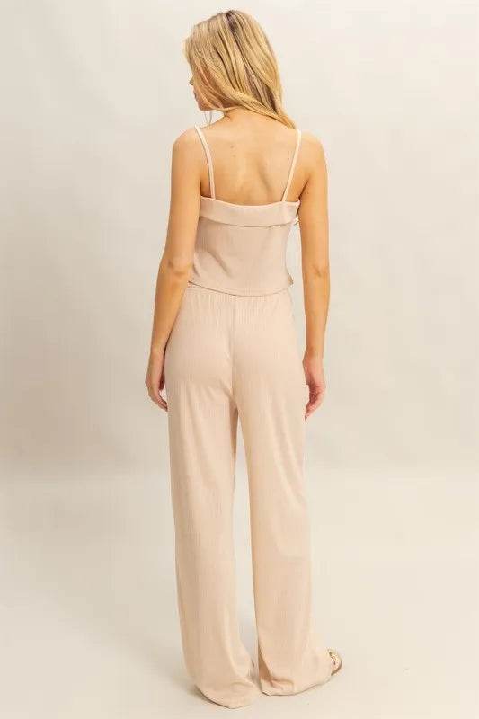 Elevate your loungewear game with this Rib Knit Cami Top and Pants Set. The ribbed knit fabric adds texture and interest to the set, creating a cozy and stylish look. The cami top offers a flattering silhouette and a hint of chic elegance, while the coordinating pants provide ultimate comfort with a stylish edge. This set is perfect for relaxing at home or running quick errands in style. Embrace comfort and fashion with this versatile and trendy loungewear set that combines style and comfort effortlessly.