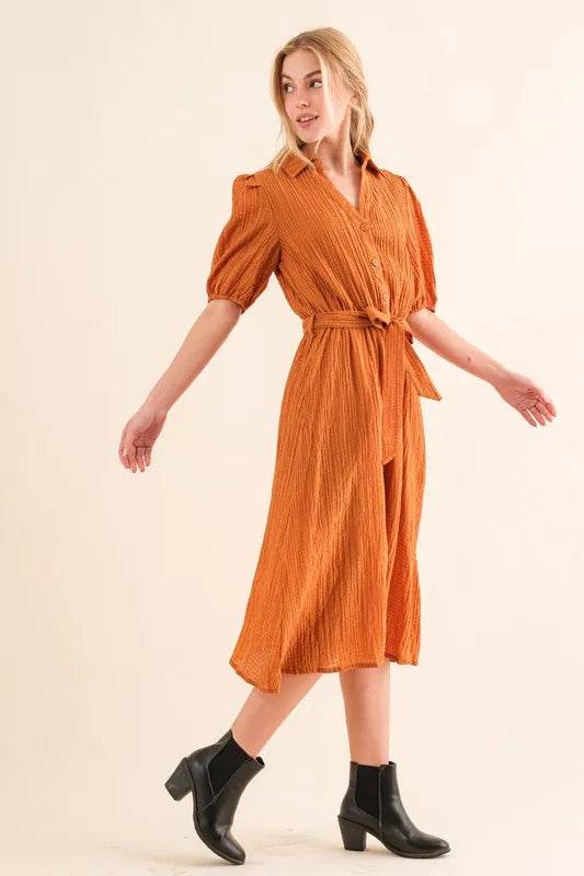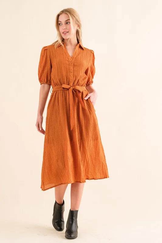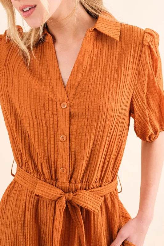 The Waffle Textured Ribbon Waist Midi Dress is a chic and elegant choice for a special occasion. The waffle texture adds depth and interest to the dress. The ribbon waist detail creates a flattering silhouette. This midi dress is versatile and can be dressed up or down depending on the event. Pair it with heels and statement jewelry for a sophisticated look, perfect for weddings or cocktail parties.