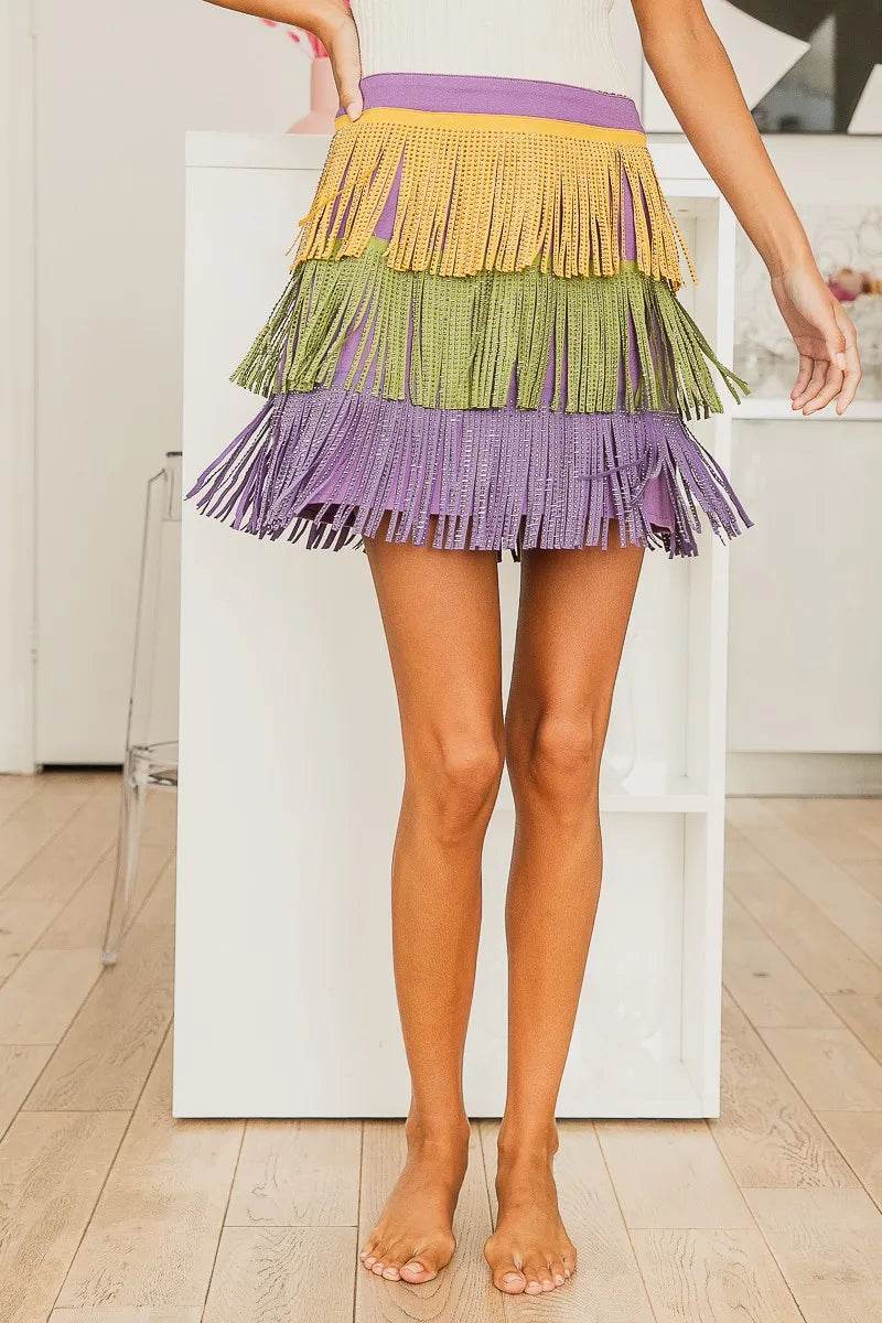 This Mardi Gras-themed skirt features dazzling rhinestones and festive fringe detailing for a fun and vibrant look. The rhinestones add sparkle and glamour, while the fringe enhances movement and adds flair to the design. Perfect for adding a touch of celebration to your outfit, this skirt is ideal for Mardi Gras events, parties, or any festive occasion where you want to stand out and shine.