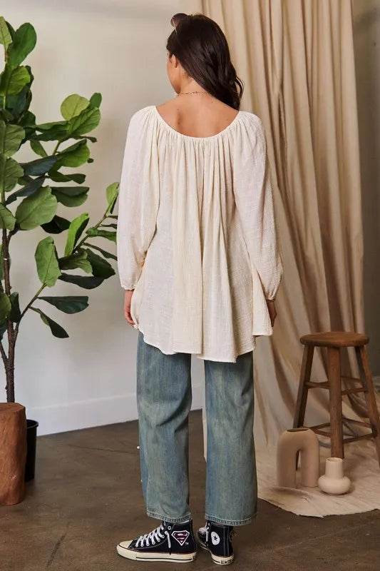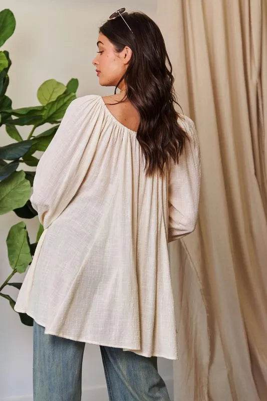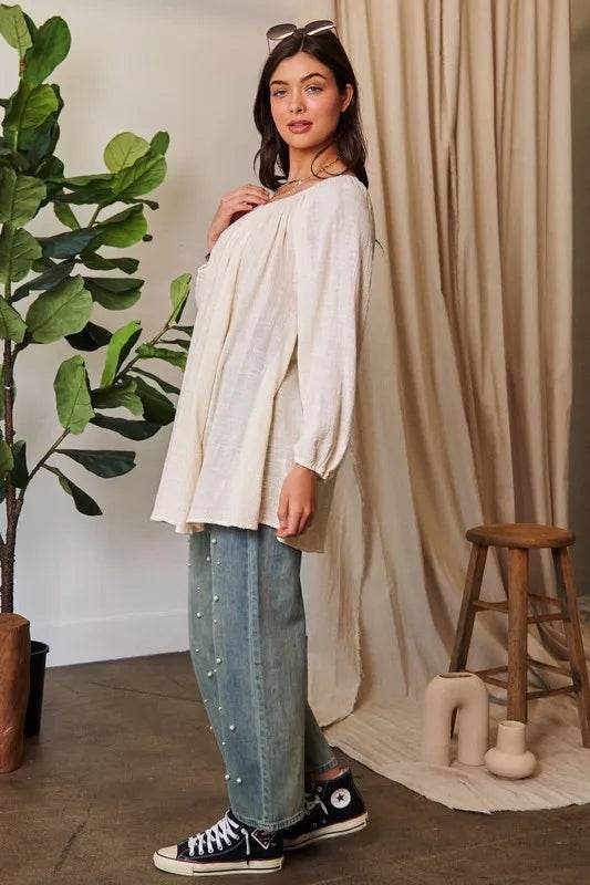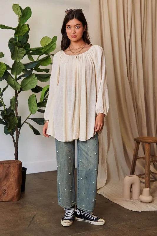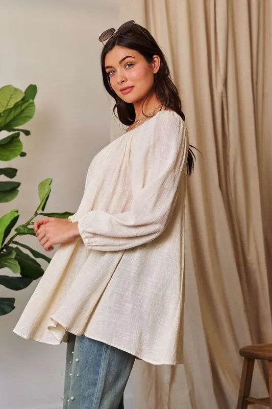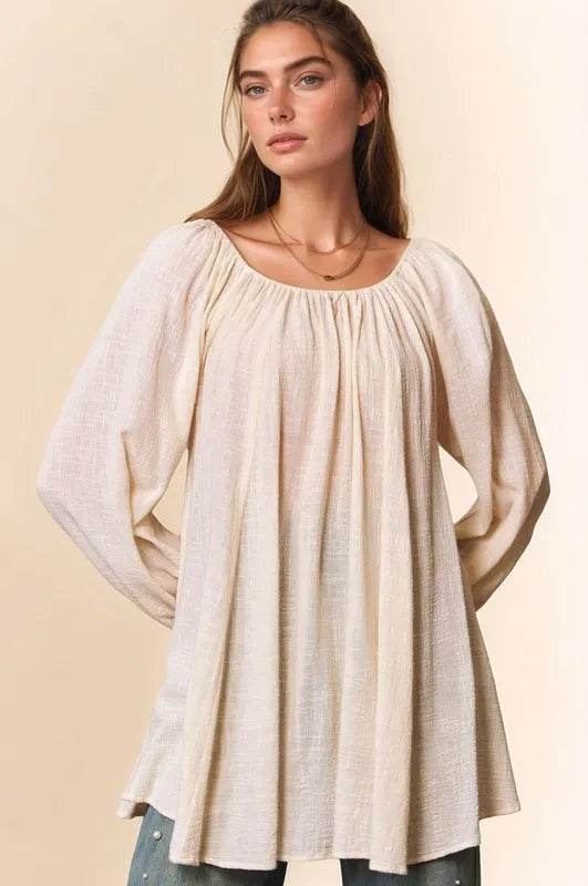 A crinkled texture fabric round neck swing top is a versatile and stylish piece that features a unique, textured fabric with a relaxed and swingy silhouette. The crinkled texture adds depth and interest to the fabric, while the round neck design provides a classic and flattering neckline. This top is perfect for a casual yet chic look and can be paired with jeans or leggings for a comfortable and fashionable outfit.