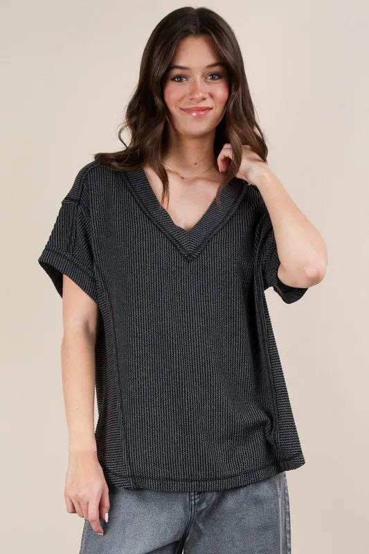 The soft two-tone ribbed knit top offers a comfortable and casual style. Its two-tone design adds a subtle yet stylish detail. Perfect for a cozy and relaxed outfit.