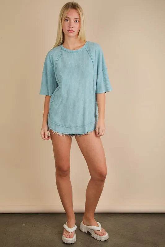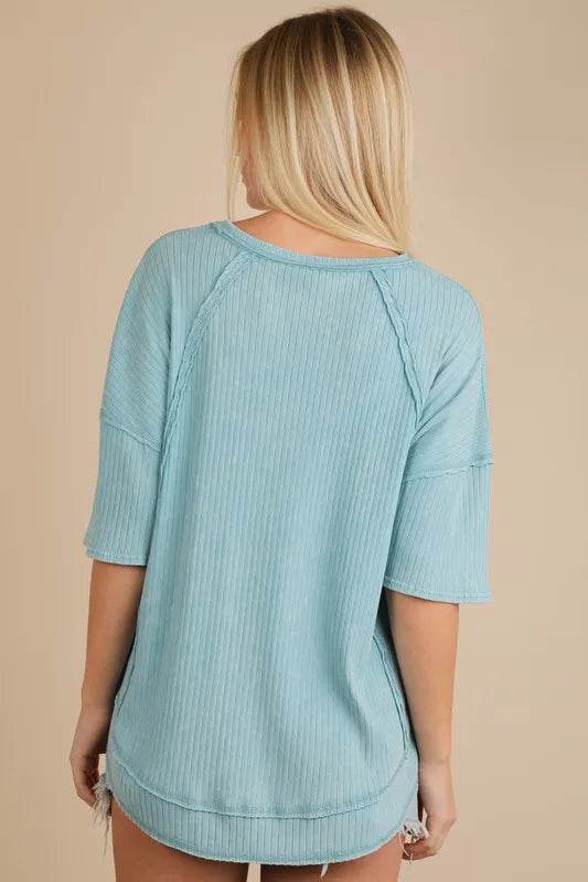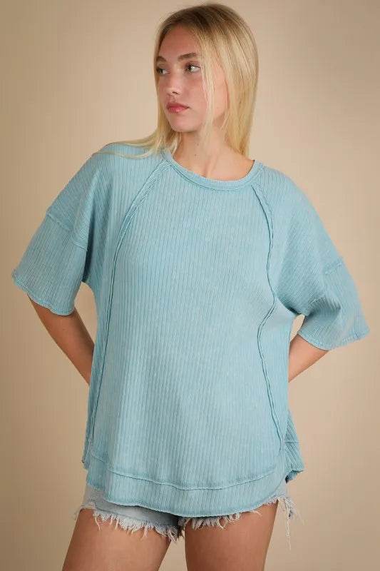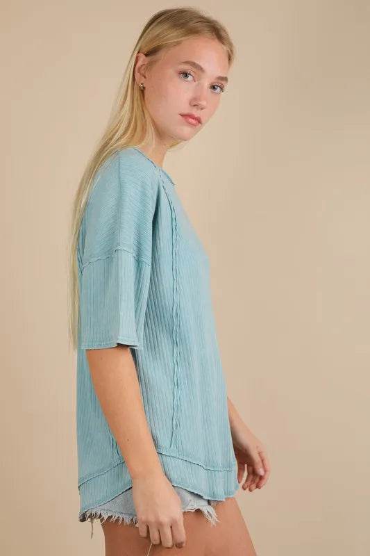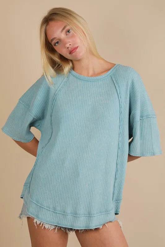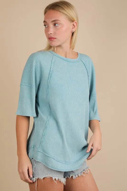 The mineral washed ribbed knit casual top combines a trendy style with comfort. The ribbed knit texture adds a unique touch to the design. Perfect for a laid-back and chic look for various occasions.
