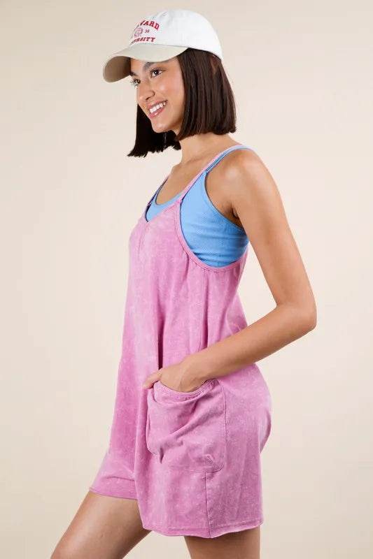 A mineral washed sleeveless knit romper offers a trendy and comfortable outfit option. The mineral washing process gives the fabric a unique and vintage look, while the knit material provides comfort and stretch. This romper is perfect for a casual day out and can be dressed up with sandals or sneakers for a stylish and effortless look.