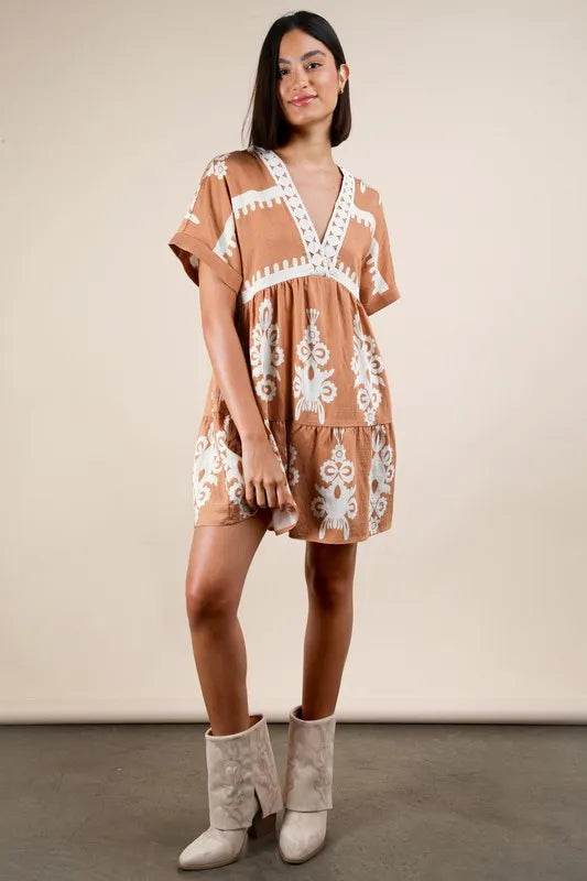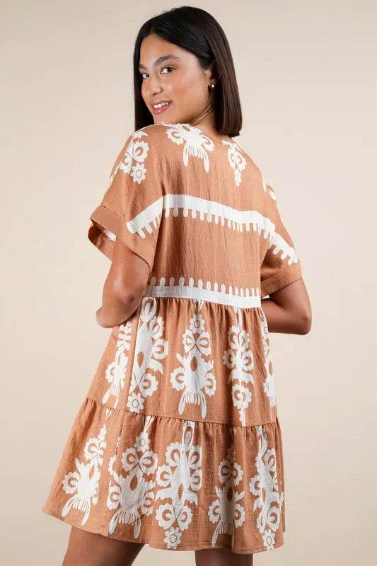The Printed V-Neck Woven Mini Dress is a stylish and versatile dress featuring a flattering V-neckline and a fun printed design. This mini dress is perfect for a variety of occasions, from casual outings to summer parties. The woven fabric gives it a comfortable and breathable feel, making it ideal for warmer weather. Pair it with sandals for a laid-back look or dress it up with heels for a more polished ensemble.
