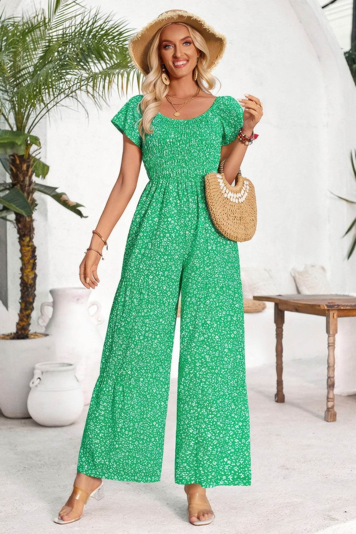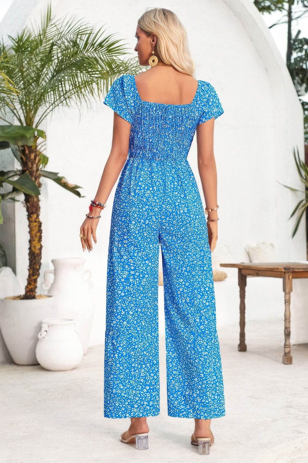 Playful yet polished, this dot print jumpsuit brings a fresh twist to classic one-piece dressing. Designed with a square neckline and ruched bodice, it creates a flattering, structured shape while staying effortlessly comfortable. The wide-leg silhouette flows beautifully, offering ease of movement and a stylish, elongating effect. Made from 100% polyester, it’s lightweight and ideal for warm-weather wear. Whether you're headed to brunch, a casual outing, or a sunny vacation day, this jumpsuit delivers charm and confidence in one easy look.