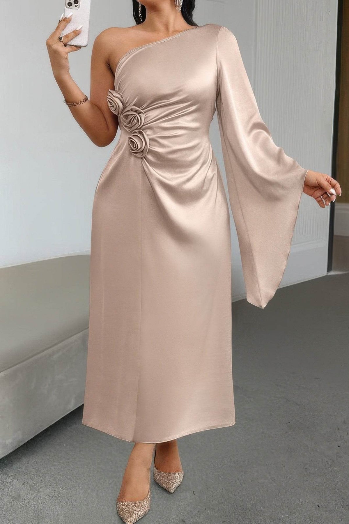 Make a stylish impression with this solid asymmetric dress, featuring a glossy finish and elegant floral decor at the neckline. The asymmetric cut adds a modern edge, while ruched detailing at the high waist enhances your shape with a flattering fit. Flared sleeves bring graceful movement and a hint of drama, perfect for both casual and slightly dressed-up settings. Crafted from 100% polyester, this dress offers a smooth feel and lightweight wear. Whether for a day out or a vacation dinner, this piece brings polish and personality to your look.